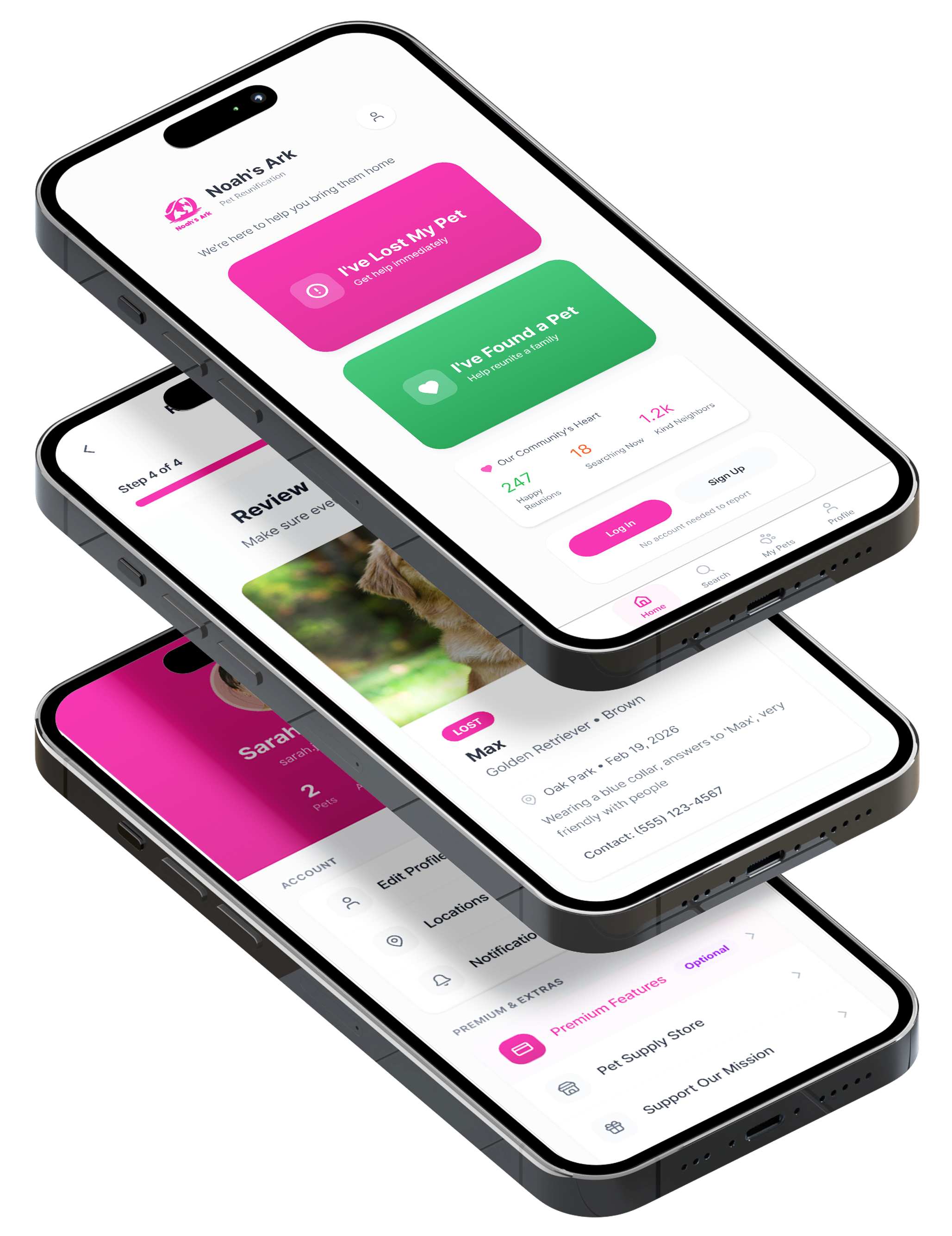 Noah’s Ark is a lost-pet recovery application designed for pet owners to take action when their pet goes missing. By converging reporting tools, pet profiles, community awareness, and search functionality into one app, Noah’s Ark aims to increase their chances of recovery.
